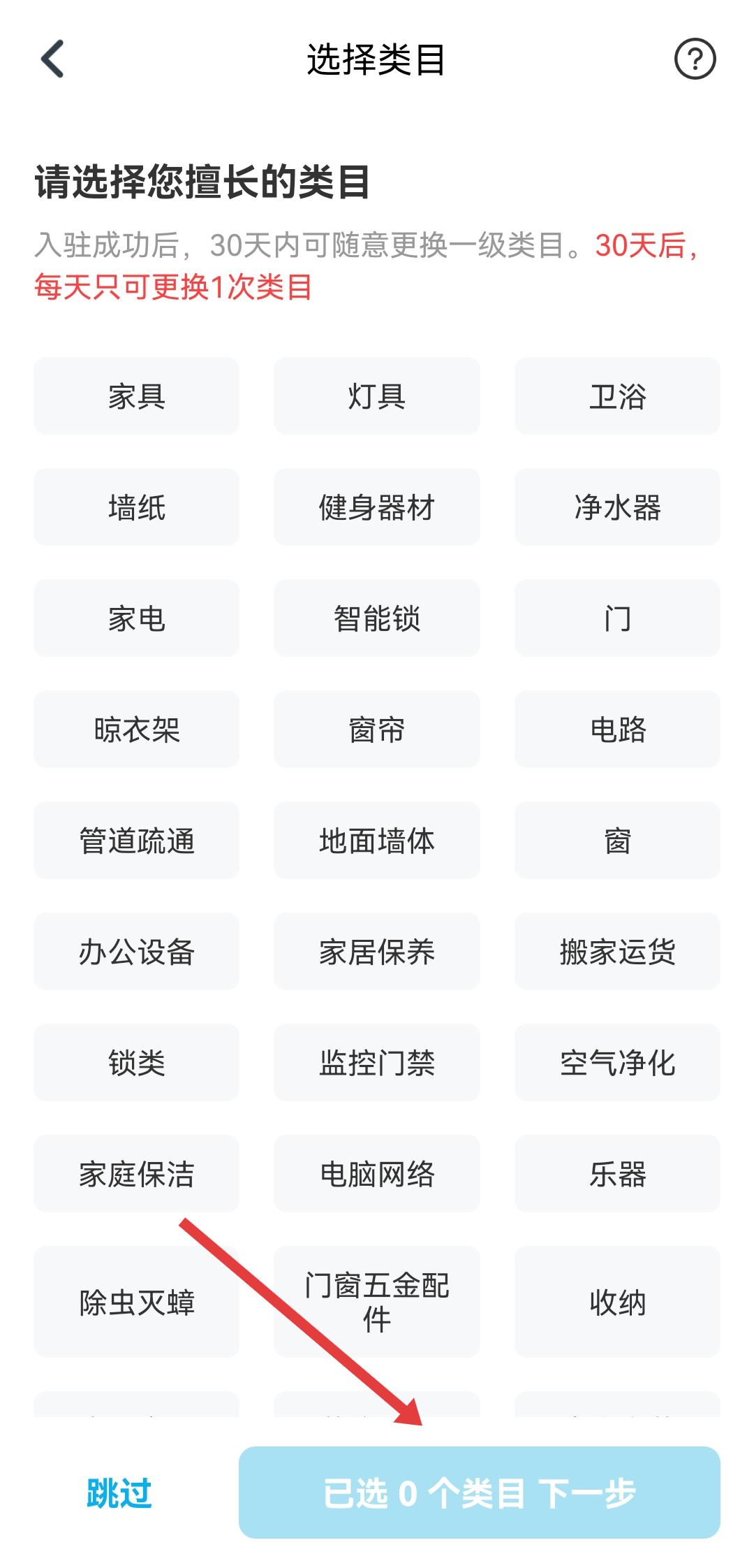 2、在选择类目页面,挑选擅长的服务类目如家具、家电等,选好后点击已选X个类目下一步按钮。