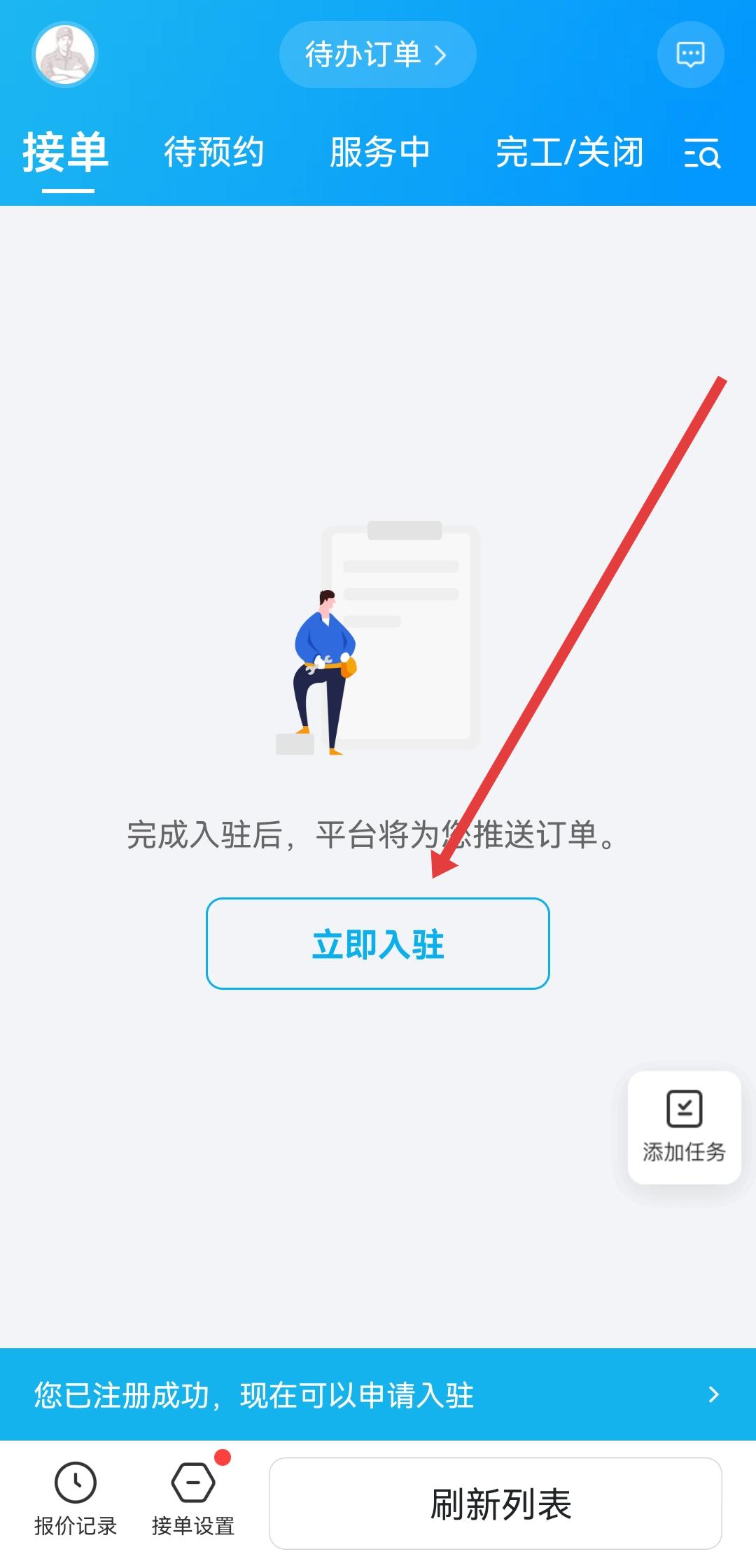 1、打开万师傅师傅版APP,进入接单的页面,需要点击立即入驻按钮,启动入驻的流程。