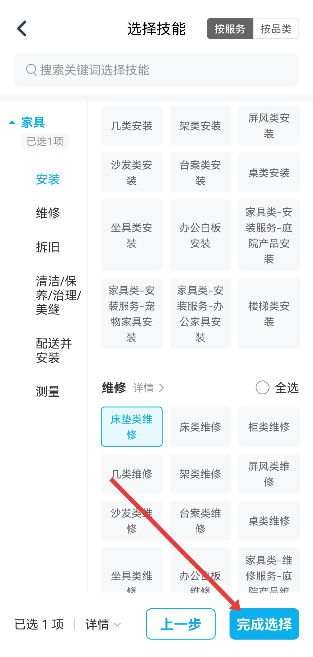 3、在选择技能页面,勾选具体服务技能如床垫类维修、桌类安装等,选完后点击完成选择按钮,提交入驻信息等待审核。