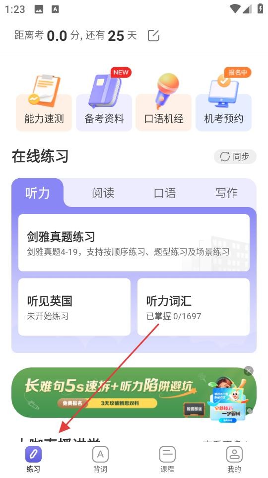 1、练习页面,有能力速测、备考资料等多种学习功能入口,在线练习板块有听力、阅读等分类,还有剑雅真题练习等学习内容。