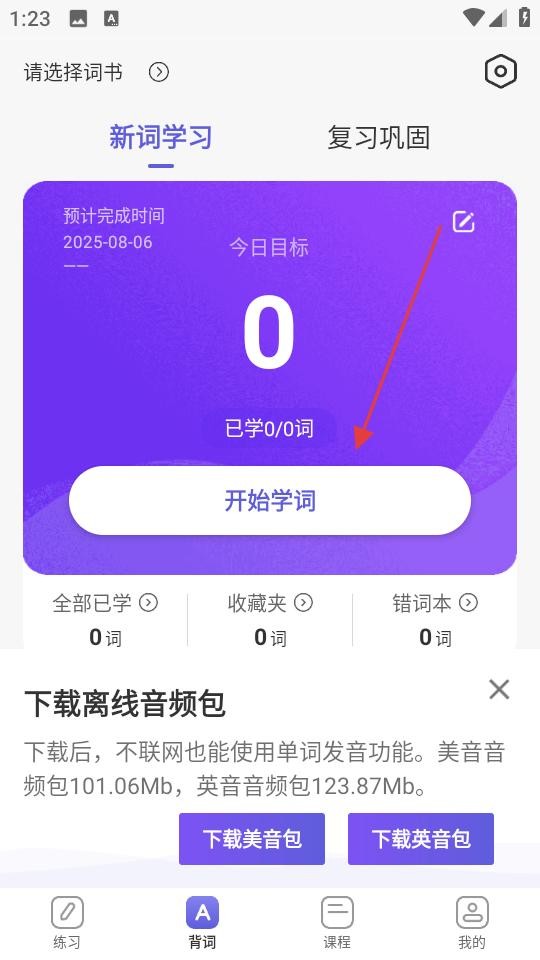 2、背词页面,有新词学习和复习巩固两种模式,用户可选择词书进行学习,还可下载离线音频包,方便在无网络时使用单词发音功能。