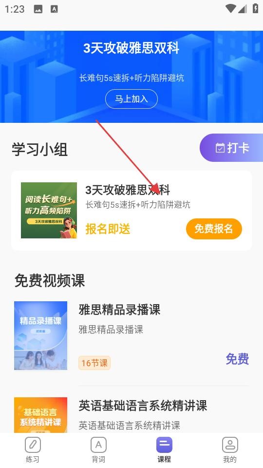 3、课程页面,有学习小组和免费视频课等板块,展示了雅思相关的课程信息,用户可在该页面选择课程进行学习。
