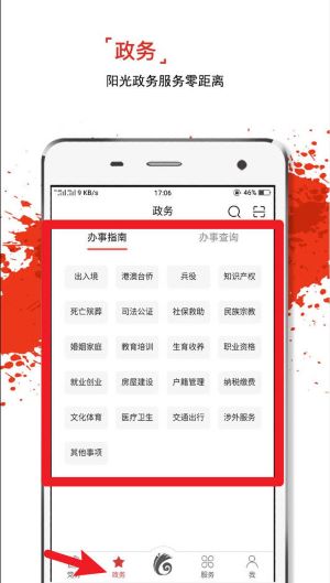 1、打开云岭先锋APP,在底部导航栏点击“政务”进入政务服务操作页面,如“出入境”或“社会救助”,点击进入详情办理流程。