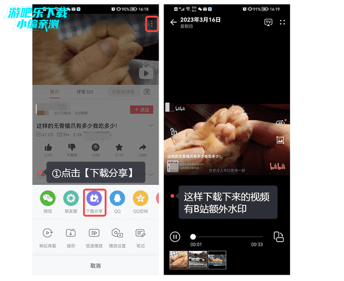 这个方法并不完美,通过这个方法下载来的视频带有B站额外的水印,不仅不适合保存反复观看,更不适合当素材使用。如果你不介意,B站视频下载就可以使用这种方法,步骤非常简单:在视频详情页点击右上角三个点,再点击【下载分享】即可保存到相册里了。