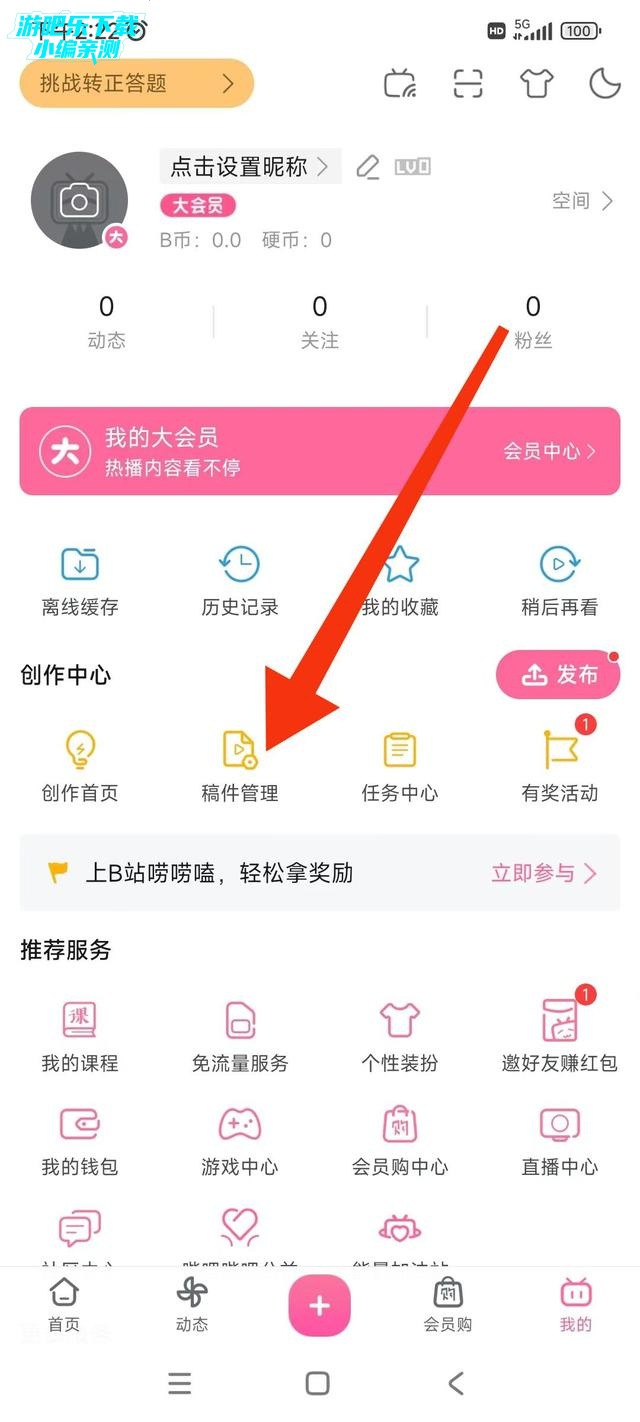 2.接着,在个人主页,找到创作中心,点击“稿件管理”进入