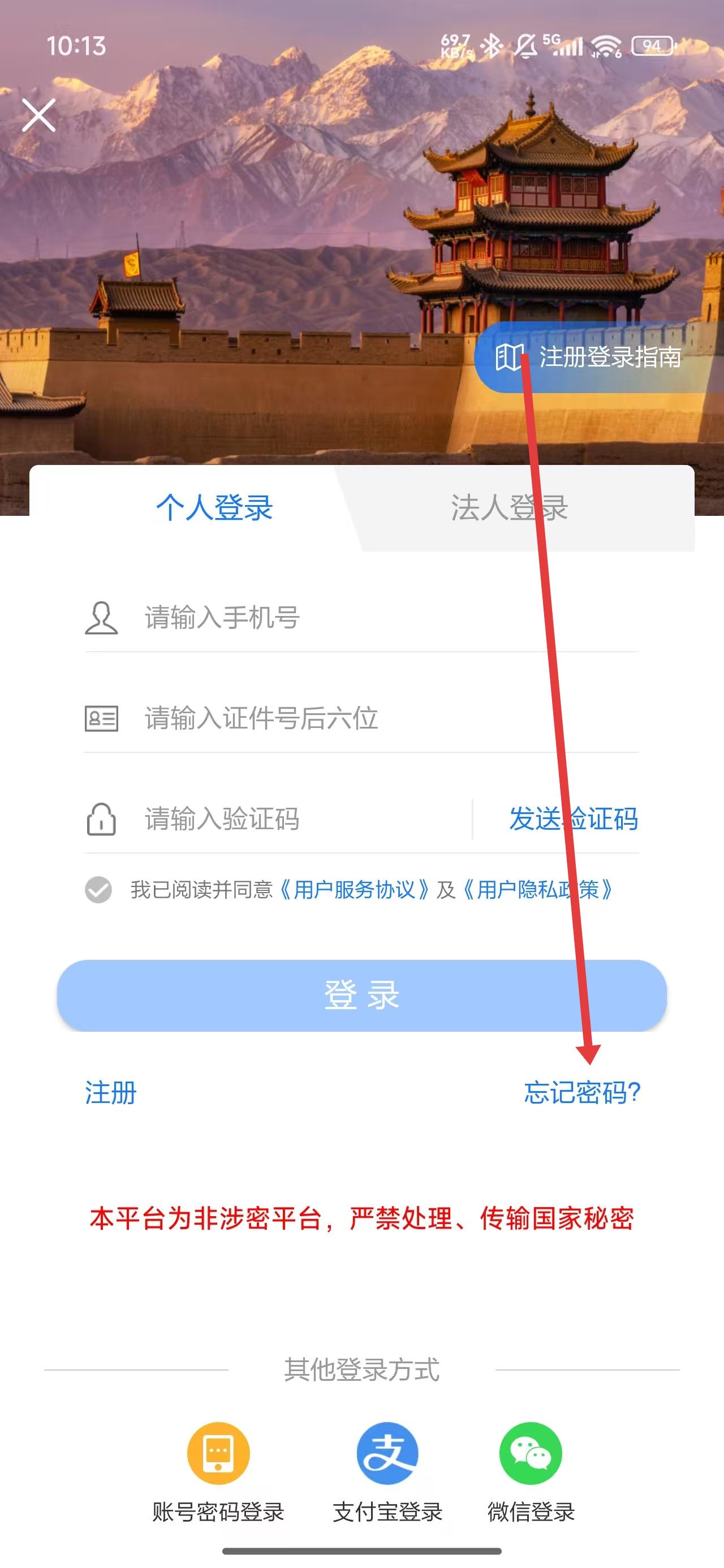 1、在登录页面中,如果忘记了账号密码,可以点击下面的忘记密码按钮进行解决。
