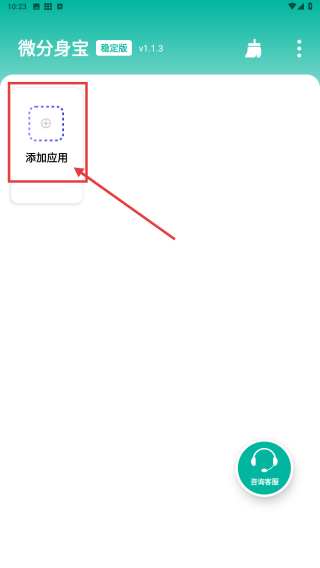 1、打开微分身宝应用,点击添加应用按钮,进入应用选择界面。