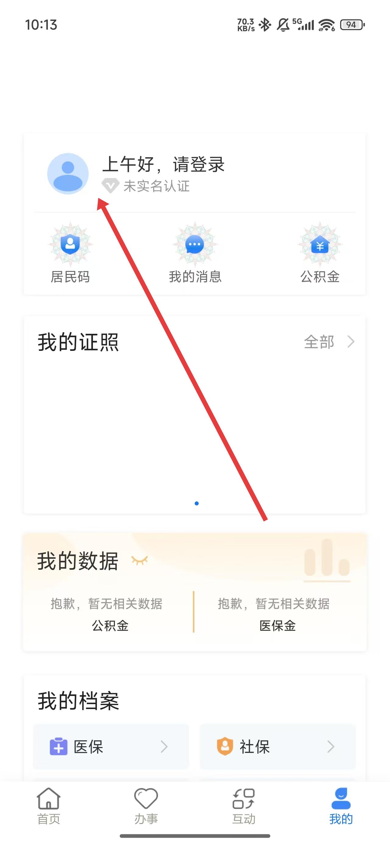 2、在进入到我的主页后,可以点击头像区域进行登录操作。