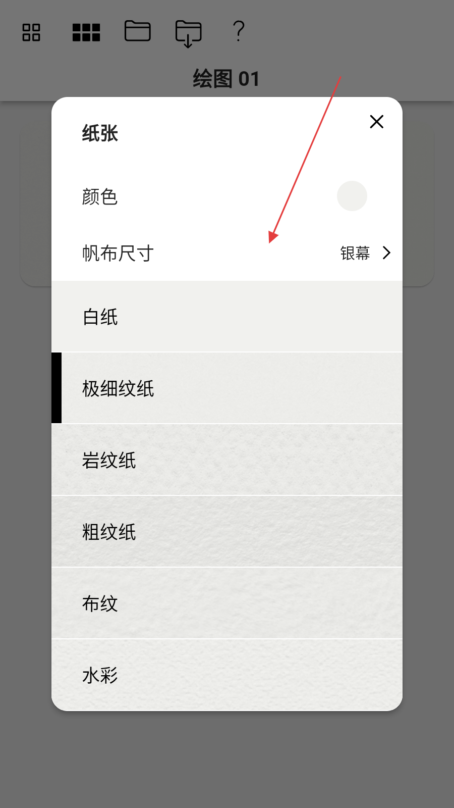 2、在纸张设置菜单中,找到帆布尺寸选项并点击,进入帆布尺寸选择界面查看预设及自定义选项。