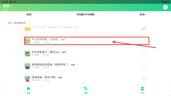 2、在发现页面的分享文件列表里,找到鸟儿摇演奏器古蘑菇.apk文件。