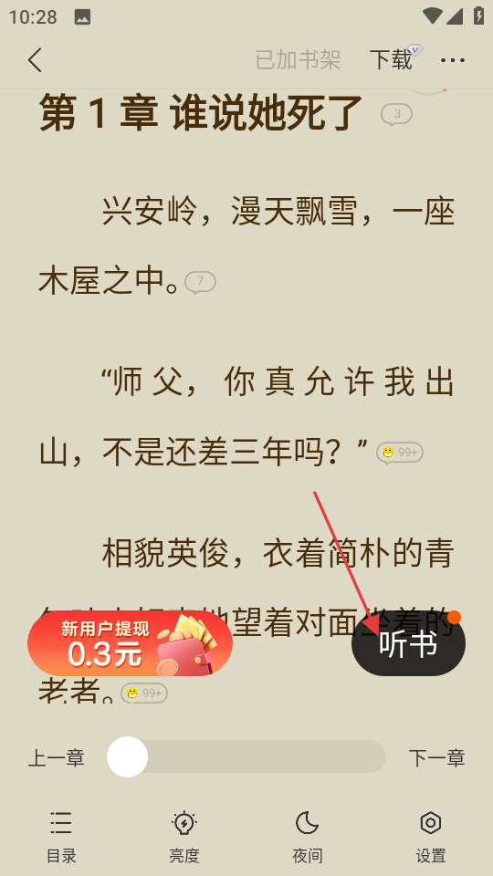 3、享受附加功能:阅读时可开启听书功能切换音频模式,在评论区分享阅读感受,用内容笔记记录重点,积累金币,达到条件后进行兑现,享受福利。