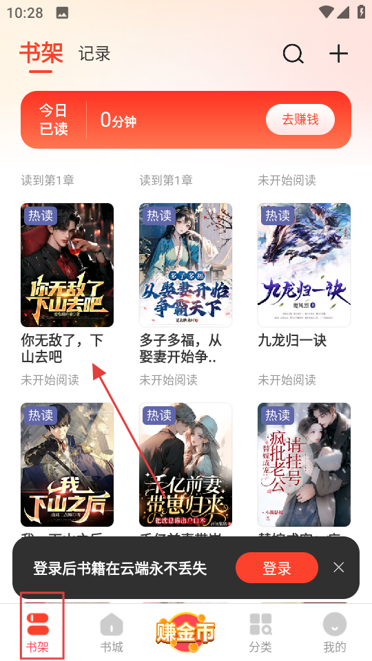 1、在书架页选你无敌了下山去吧,进入阅读页。