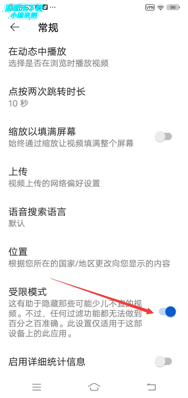 4、在最下方有一个“受限模式”大家点击一下就关闭了,蓝色就代表打开状态,灰色是关闭状态。