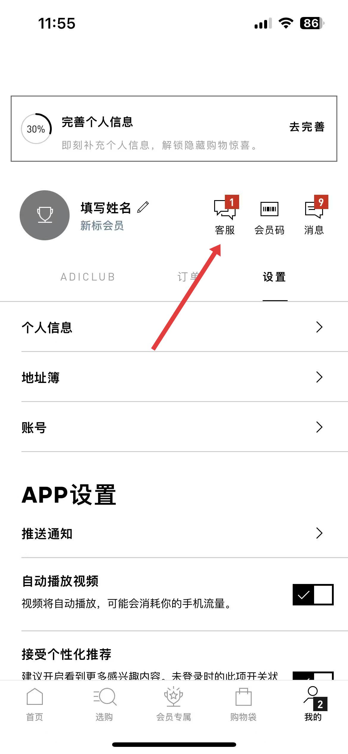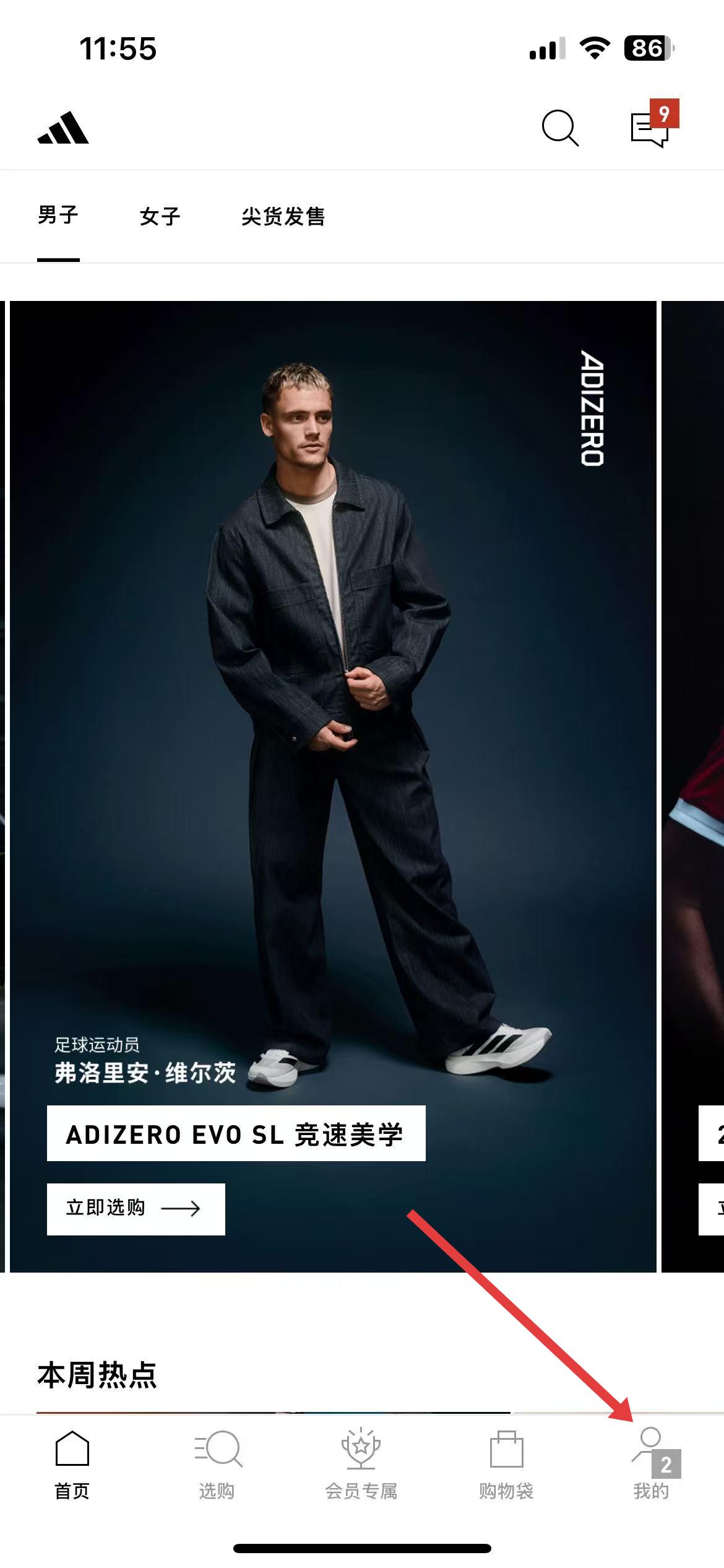 1、打开阿迪达斯app,进入首页后点击底部导航栏最右侧我的图标进入个人界面。