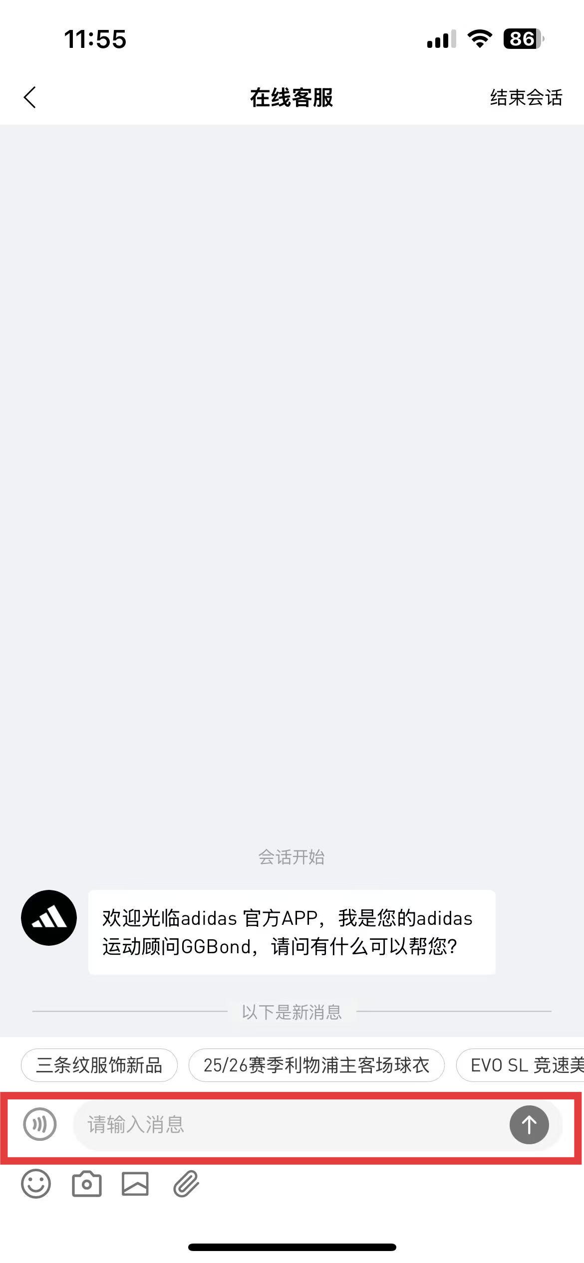 3、在线客服界面下方文本框中,输入你想要咨询的问题然后点击发送按钮,即可与阿迪达斯app的客服进行沟通。