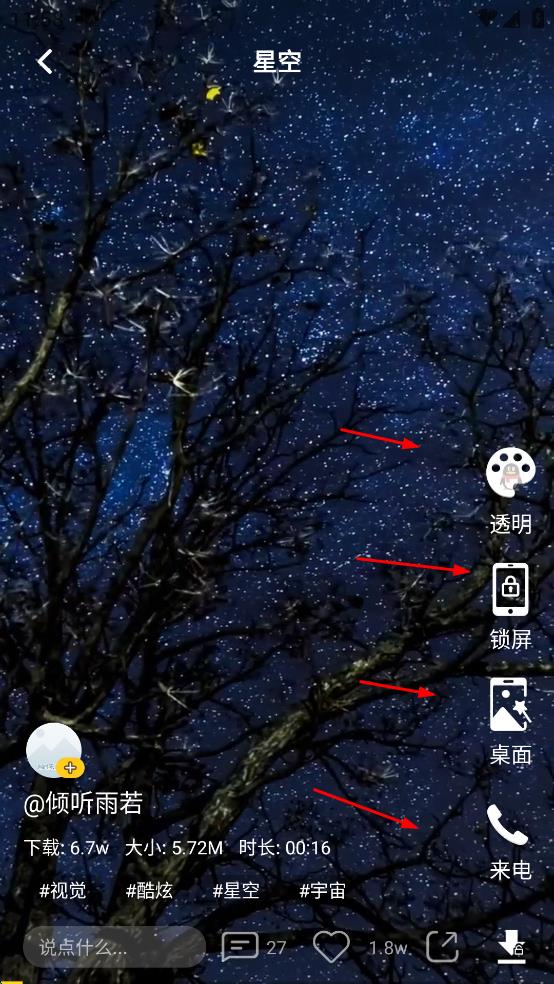 3、在星空壁纸详情页,可看到右侧“透明”“锁屏”“桌面”“来电”等功能选项,按需点击使用 。