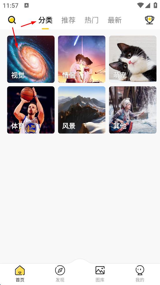 1、打开壁纸应用,点击顶部“分类”标签,在分类页面选择“视觉”类别,进入视觉壁纸列表 。
