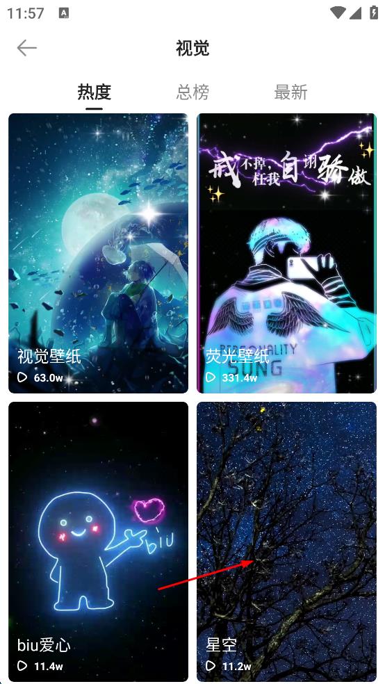 2、在视觉壁纸热度榜单里,找到“星空”壁纸,点击该壁纸,进入其详情展示页面 。