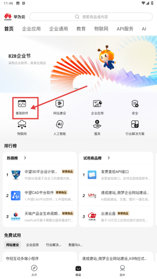 2、在商品页面,点击基础软件图标,进入模板市场分类界面。