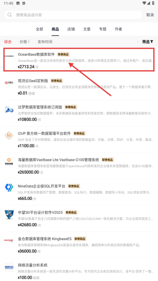 3、在模板市场商品列表里,找到OceanBase数据库软件商品,查看详情。