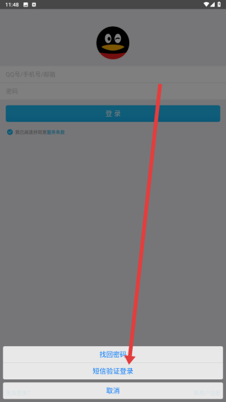 2、在弹出的选项中,可以通过点击短信验证登录选项,进行登录。