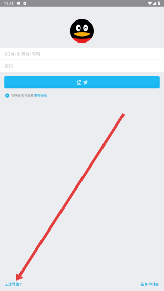 1、在QQ登录页面中,要是无法登录账号,可以点击底部的无法登录按钮解决。