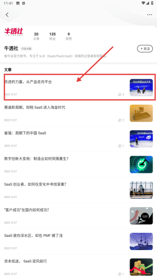 3、在牛透社主页文章列表里,点击跃进的力量从产品走向平台文章,查看详情。