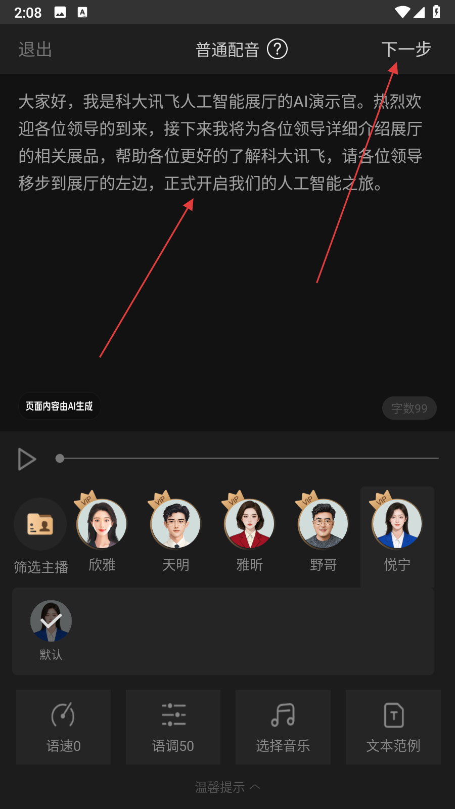 3、在编辑页面选择主播、调节语速语调、添加背景音乐,确认文本无误后点击右上角下一步,等待系统合成配音并保存使用。