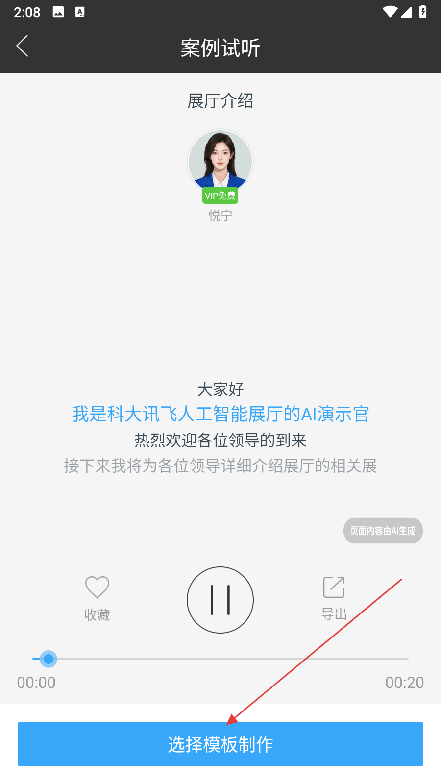 2、在案例试听页面,试听模板音频效果,点击底部选择模板制作按钮,跳转至普通配音编辑页面,模板文本自动填入输入框。
