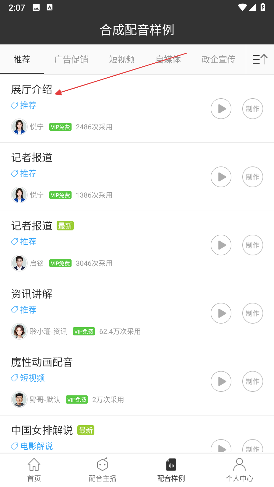 1、打开讯飞配音应用,点击底部配音样例选项,在推荐、广告促销等分类中找到目标模板,点击进入案例试听页面。