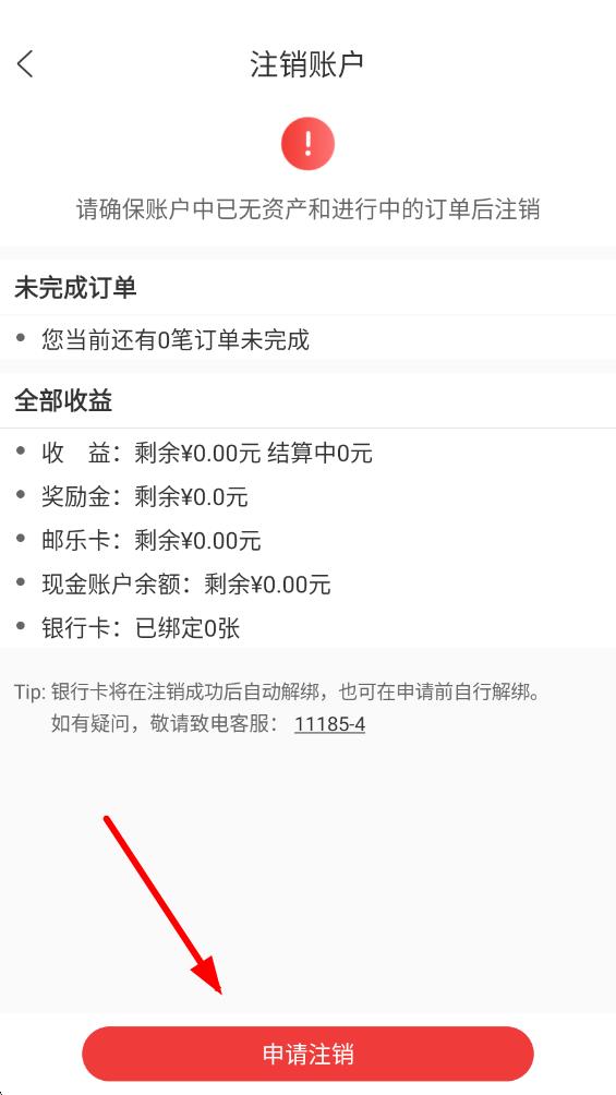 3、在注销账户页面,确认账户中无资产和未完成订单后,点击下方的申请注销按钮,按照提示完成后续操作,即可成功注销邮乐网账号。