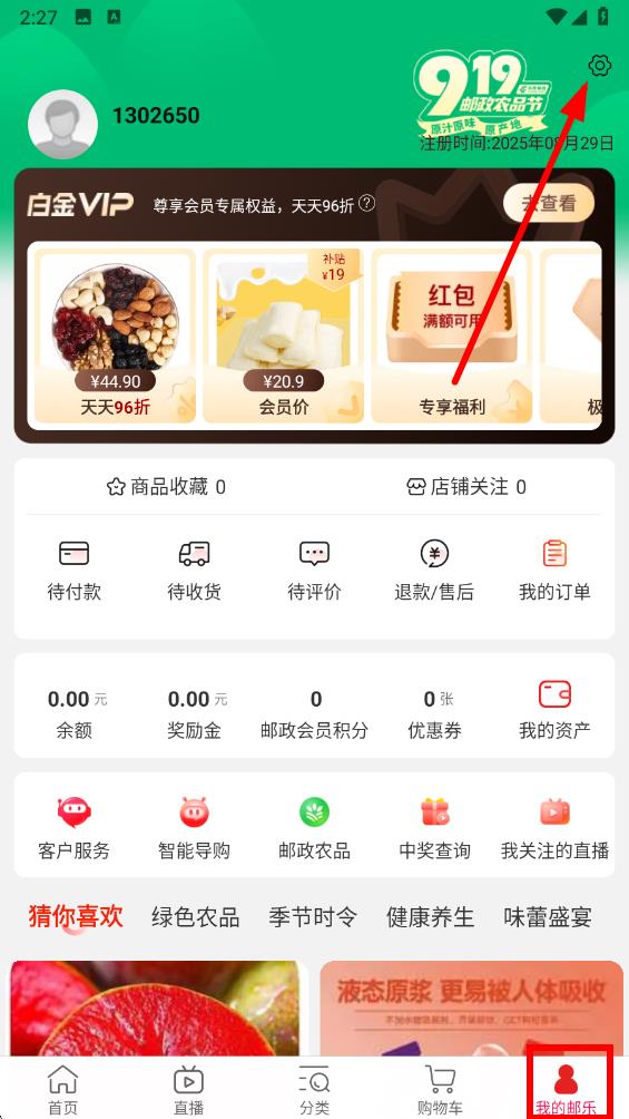 1、打开邮乐网app,点击底部导航栏中的我的邮乐选项,进入个人页面,点击页面右上角的设置图标。