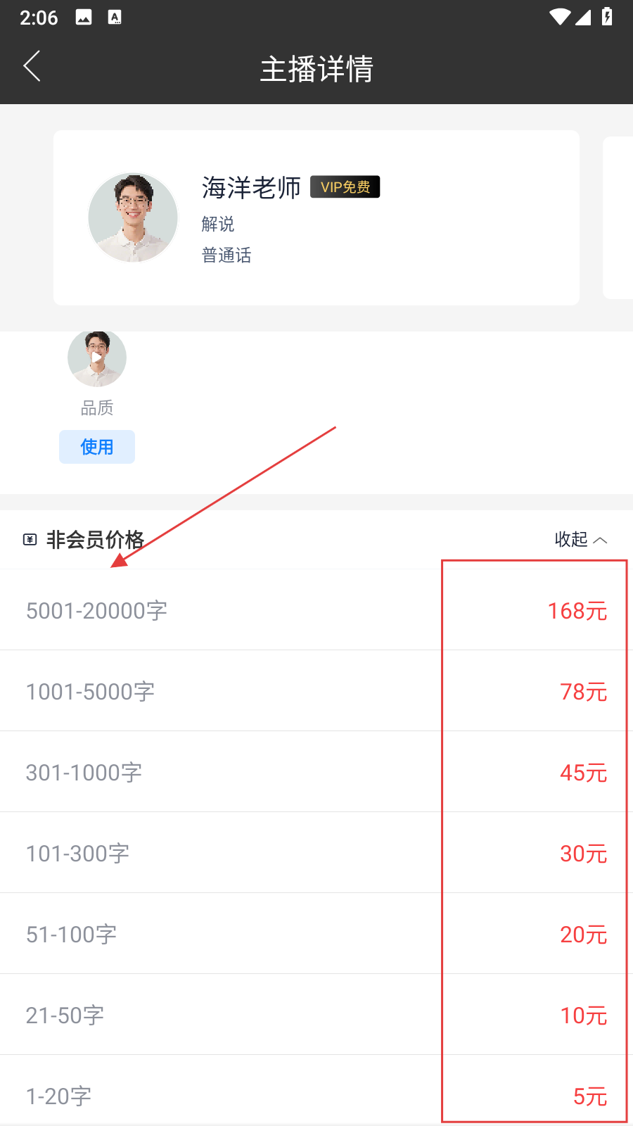 2、进入主播详情页,找到非会员价格栏,点击右侧展开按钮。