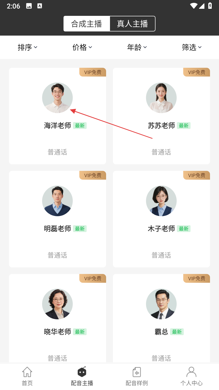 1、打开讯飞配音应用,点击底部配音主播选项进入主播列表,切换合成主播或真人主播标签,选择目标主播。