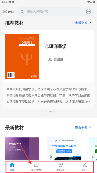1、进入应用首页,点击底部所有教材选项,浏览全部教材列表。