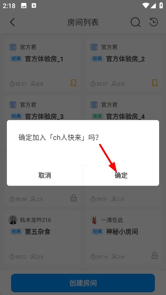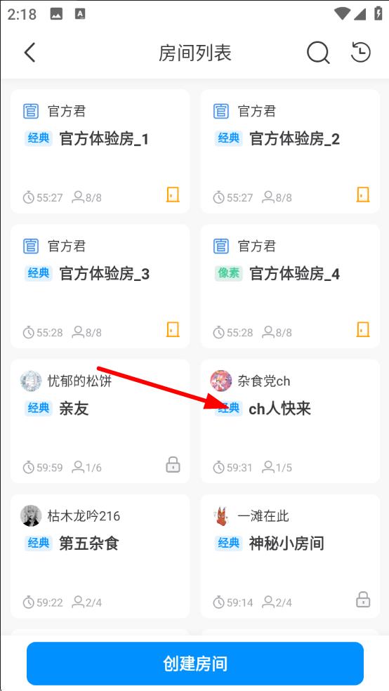 2、在房间列表中,选择一个想要加入的茶绘房间,点击房间名称。