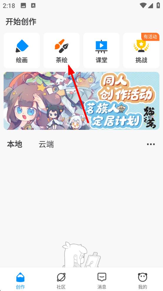 1、打开熊猫绘画应用,点击主界面茶绘选项,进入茶绘相关操作入口。