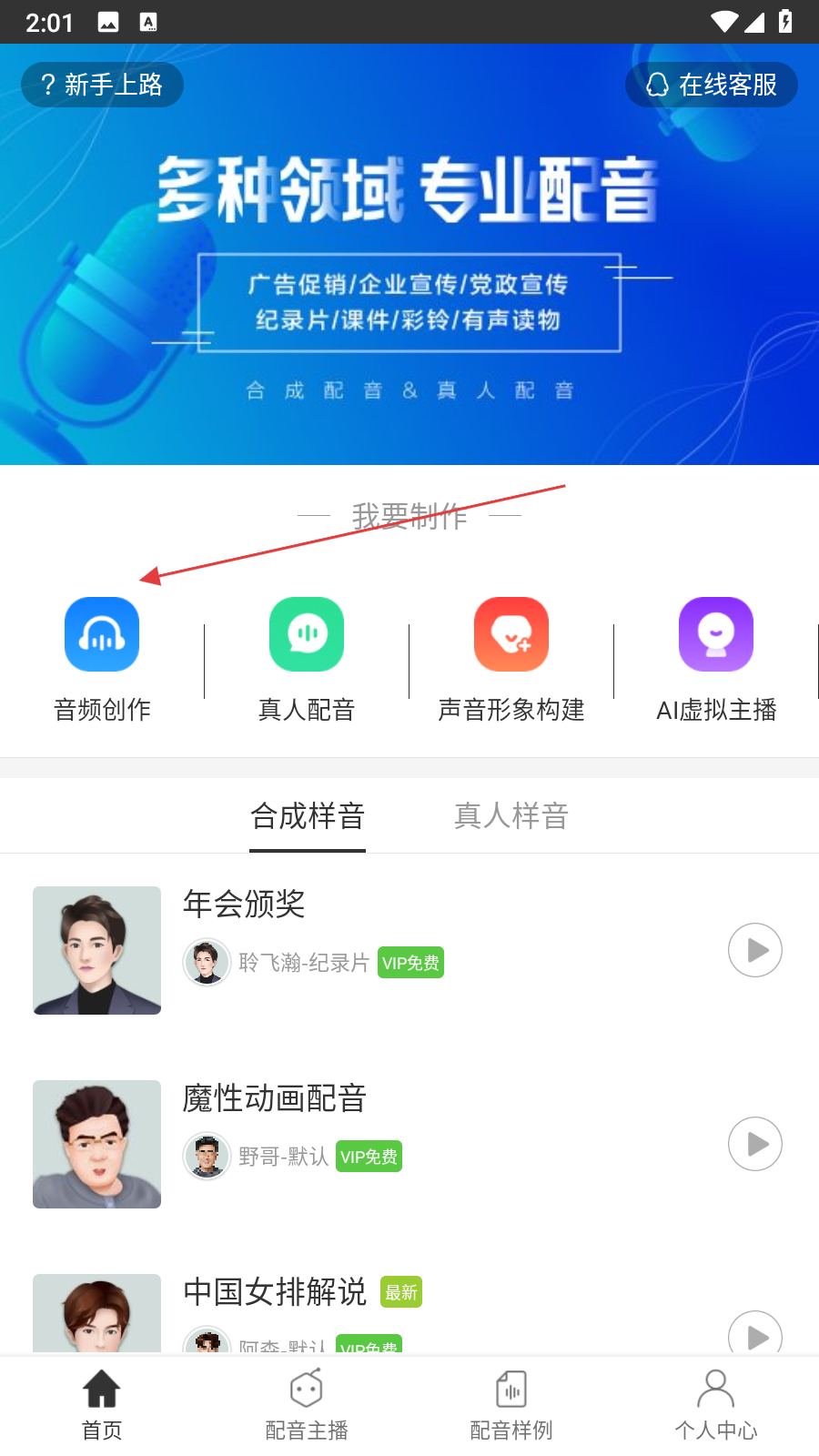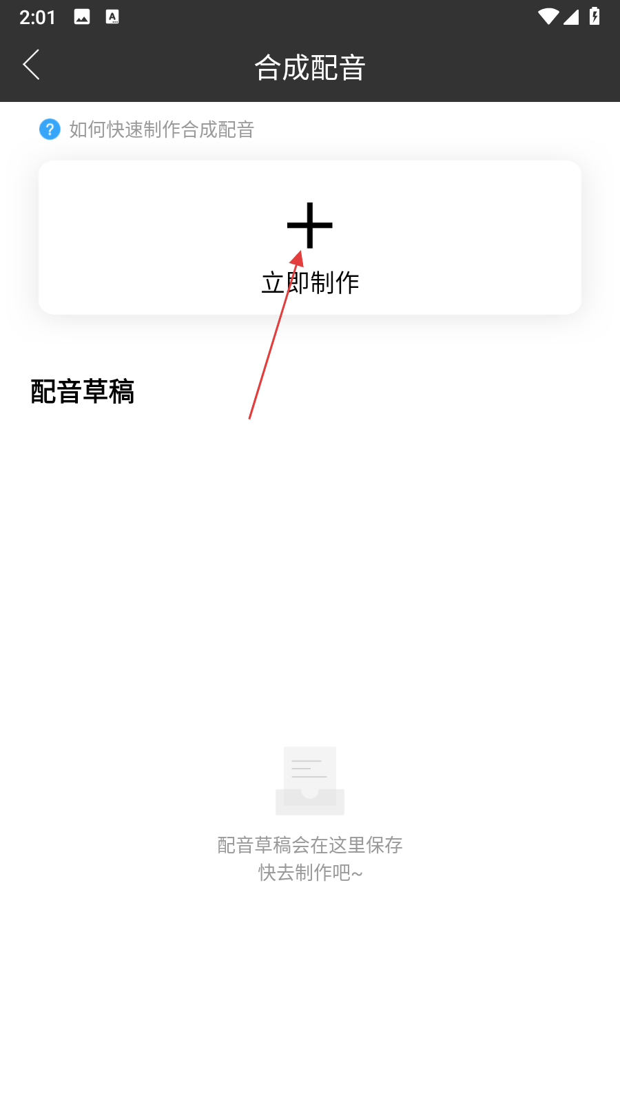 1、打开讯飞配音应用,在首页点击音频创作选项,进入合成配音页面,点击立即制作按钮,跳转至普通配音编辑界面。