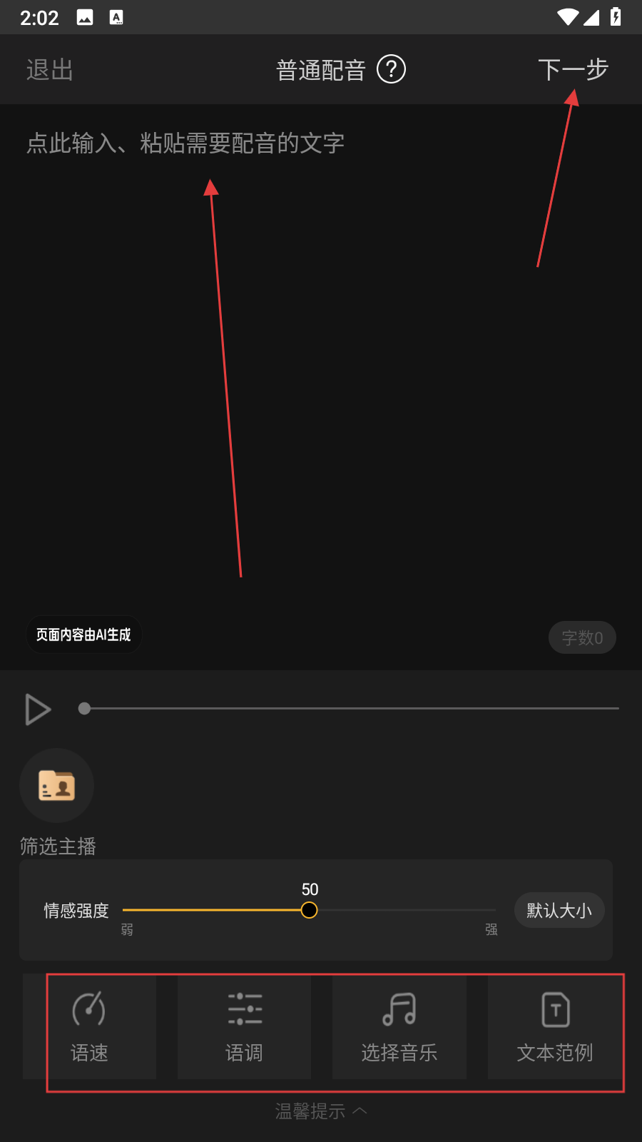 2、在编辑界面输入需配音的文字,下方调节情感强度、语速、语调,也可选择音乐或查看文本范例,设置完成后点击右上角下一步。