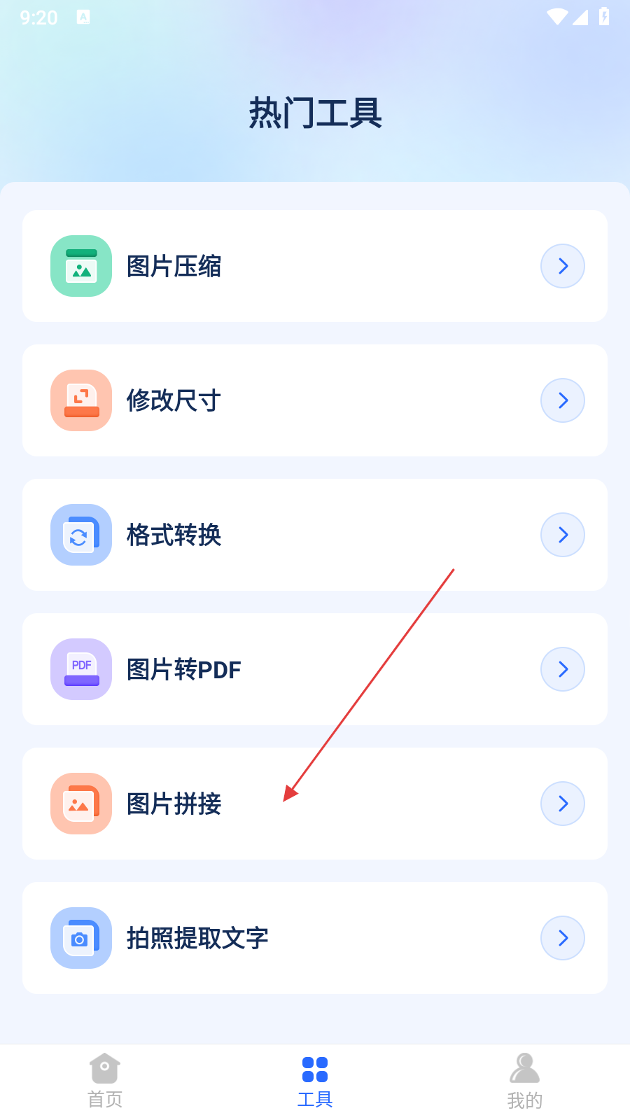 1、打开开心手机恢复大师应用,点击底部导航栏工具选项,进入热门工具页面,在工具列表中找到图片拼接功能并点击进入。