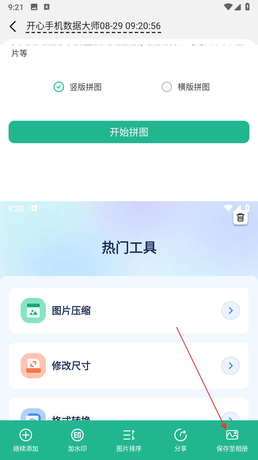 3、照片选取后,可按需调整图片顺序等,完成后点击底部保存至相册,拼接好的照片即保存到手机相册。