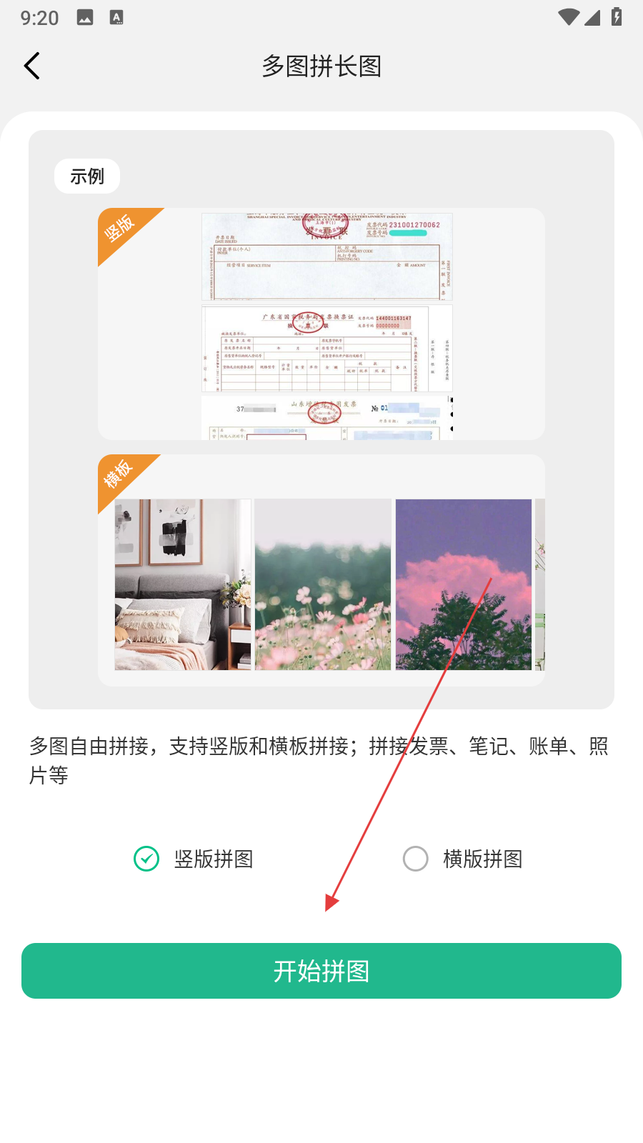 2、在图片拼接页面,选择竖版拼图或横版拼图模式,点击开始拼图按钮,进入手机相册选取需拼接的照片。