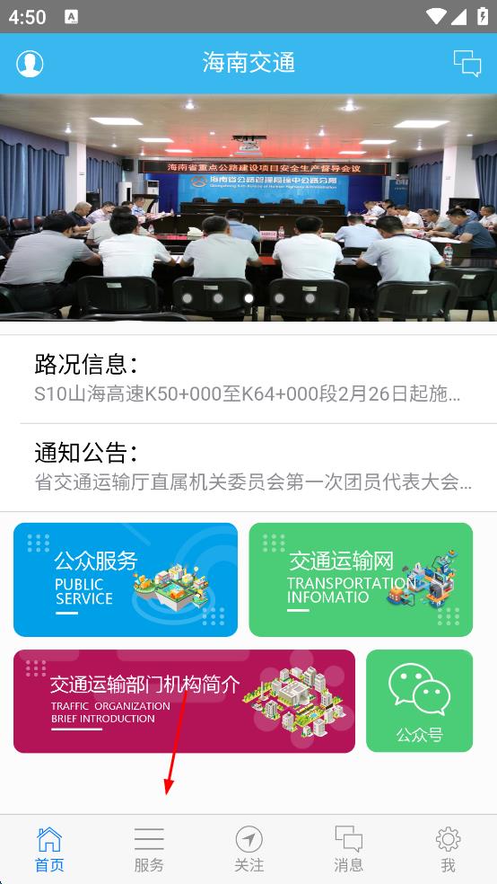 1、打开海南交通APP,在首页点击底部“服务”选项,进入服务首页。