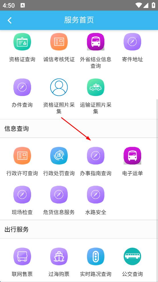 2、在服务首页,找到“办事指南查询”功能并点击,进入办事指南列表页。