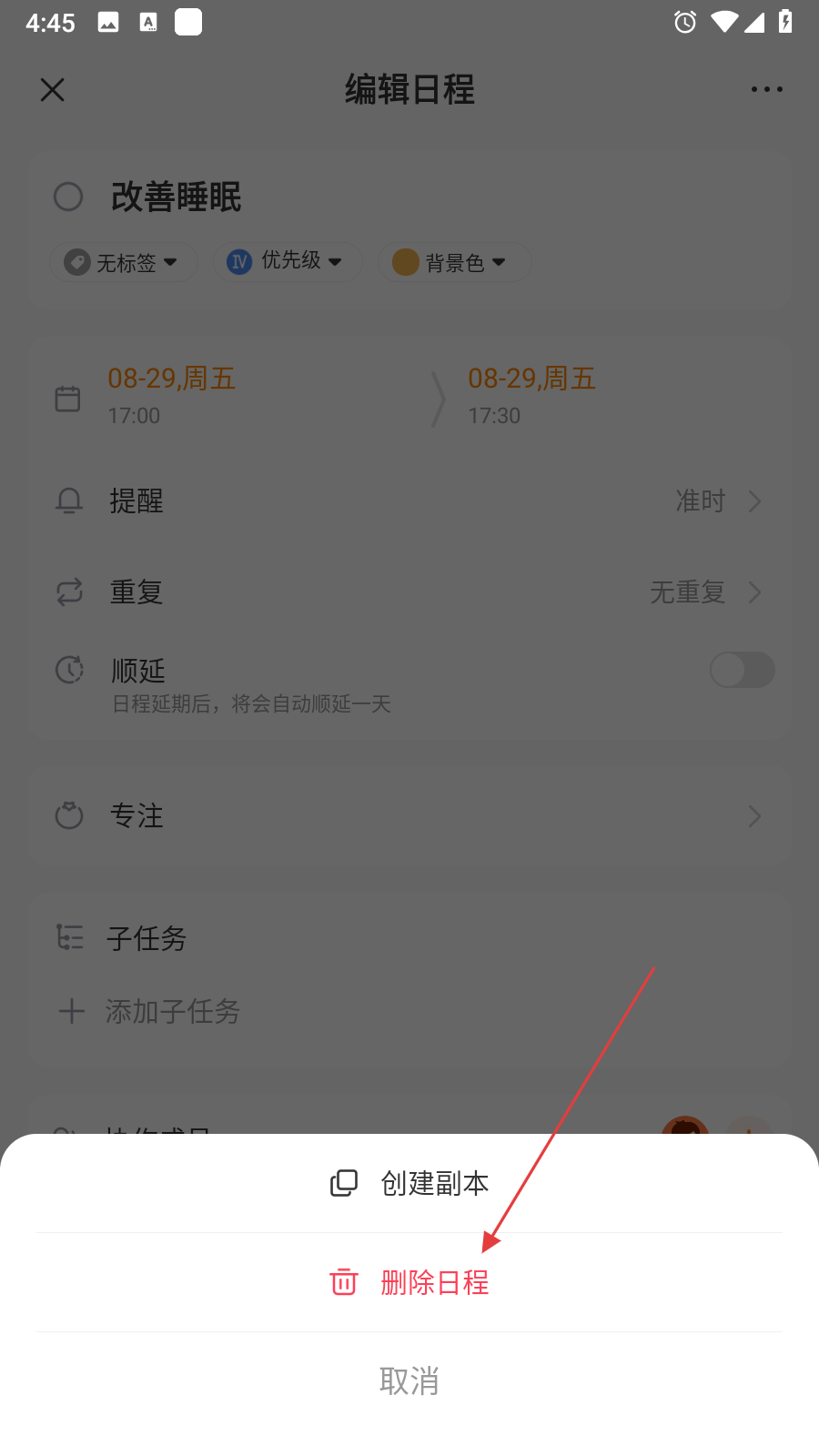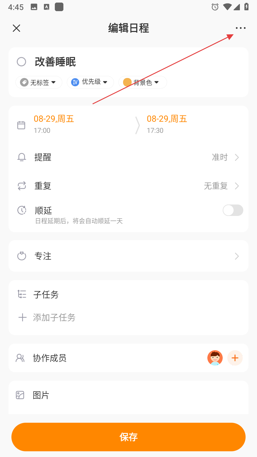 2、在编辑日程页面的右上角,找到由三个点组成的更多功能图标并点击。