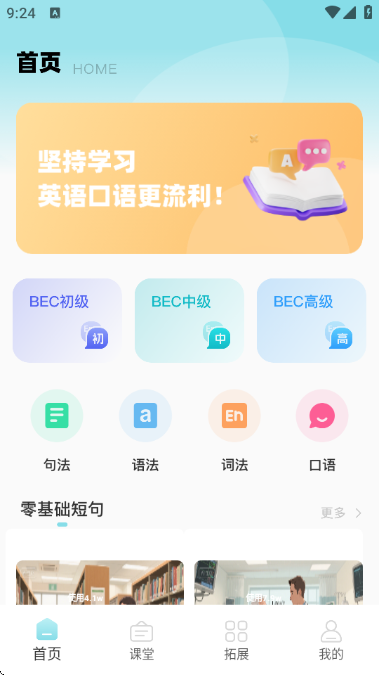 1、首页带来了句法、语法、词法、口语等学习内容,还有零基础短句知识呈现。