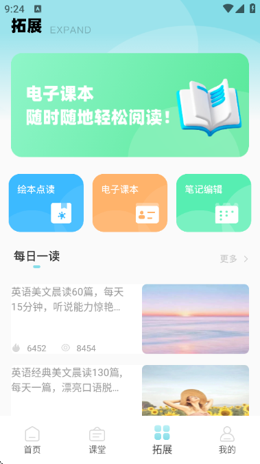 3、拓展页面则支持绘本点读、电子课本、笔记编辑等功能,还能查看精选美文素材。