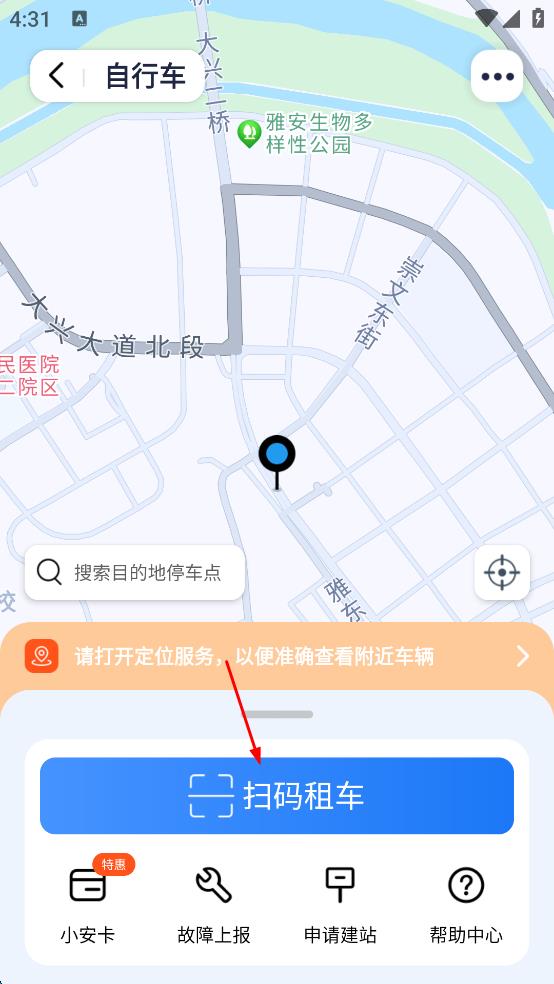 2、在自行车地图界面,点击“扫码租车”按钮,跳转至扫码页面。