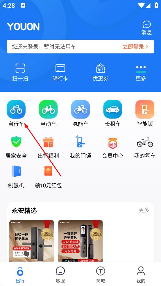 1、打开永安行APP,在出行页面点击“自行车”选项,进入自行车租赁地图界面。