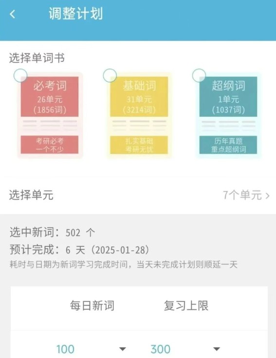 2、调整计划:用户可根据自身情况,对《【红宝书】考研英语词汇》必考词(26个单元)、基础词(30个单元)、超纲词(A-D)灵活制定学习计划。